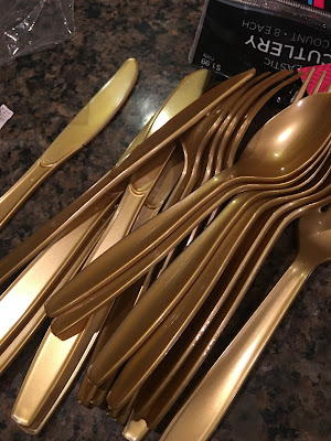 I found the plastic gold silverware at hobby lobby too and I think they were 2.99 for a set of 8 place settings. I bought three bags.