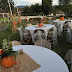 Round tables covered in white cloths with a small square of burlap and pumpkins that were hollowed out and filled with fresh flowers made for a beautiful setting. The plain metal church chairs were tied with organza to give a softer look to them.
