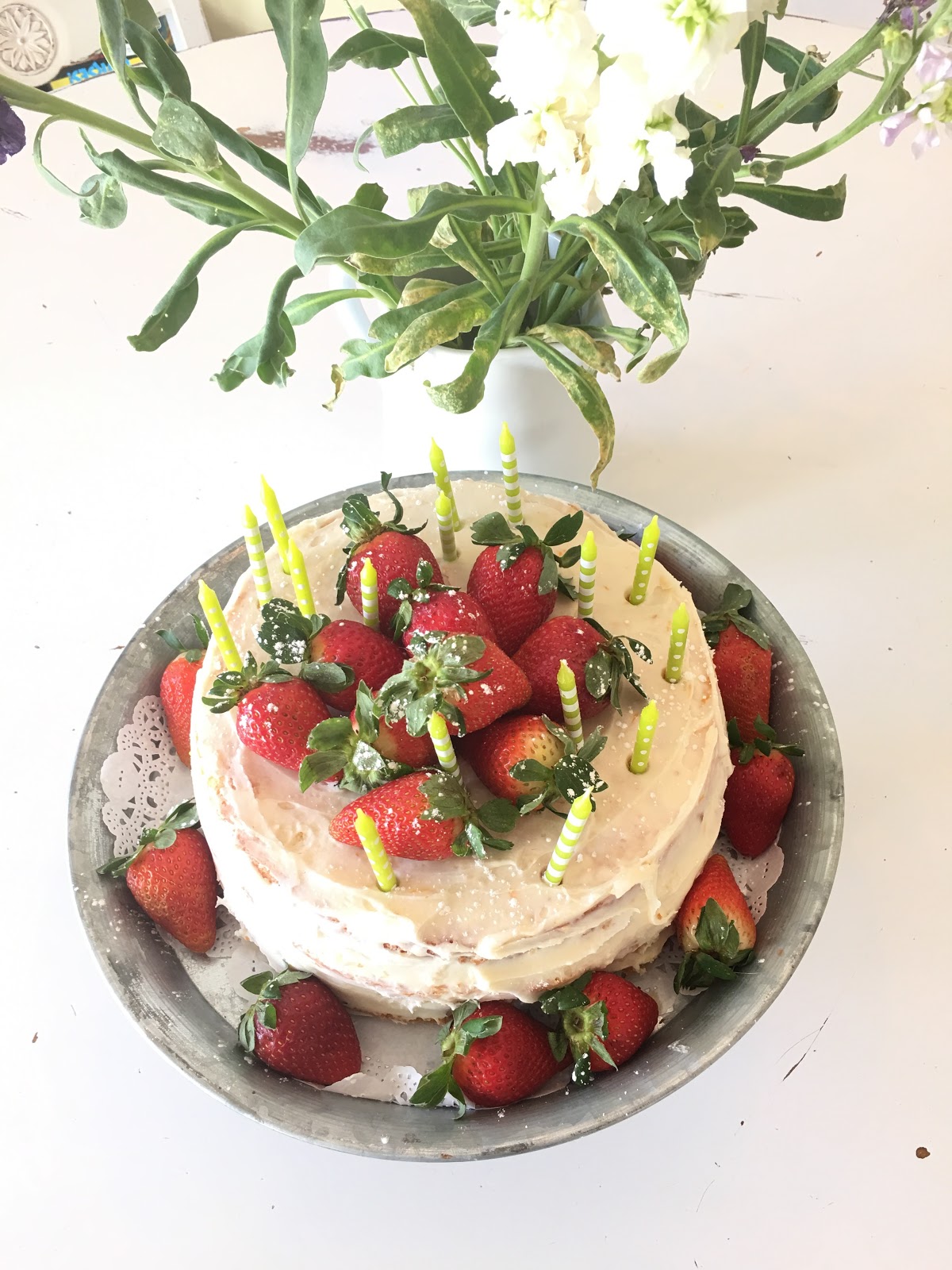 | I tried to make this a naked cake but I haven't mastered that look very well so I just added lots of strawberries on top and all around the base then I sprinkled the whole thing with powdered sugar. |